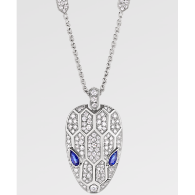 Serpenti系列吊坠项链,白色18K金材质,点缀蓝色蓝宝石双眸,链身和蛇首饰以密镶钻石